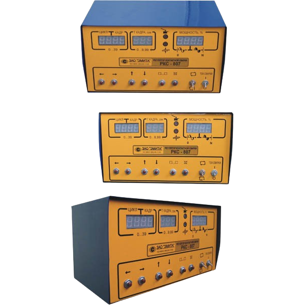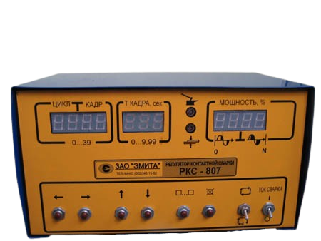 Регулятор контактного зварювання РКС 807М призначений для керування машиною контактного зварювання, оснащеного тиристорним контактором типу КТ 11, КТ 12 або КТ 7 та двома електропневмоклапанами з котушками -24В. Регулятор забезпечує роботу машини контактного зварювання за заданою технологічною програмою. В незалежній пам’яті регулятора може зберігатися до 40 технологічних програм. У технологічній програмі застосовано принцип покадрового відпрацювання. Кожна технологічна програма містить 40 технологічних кадрів, що відпрацьовуються послідовно від 0-го до 39-го кадру. У кожному кадрі програми задається: